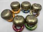 Authentic Tibetan singing bowls made from seven metals, producing healing vibrations for meditation, sound therapy, relaxation, and chakra balancing.